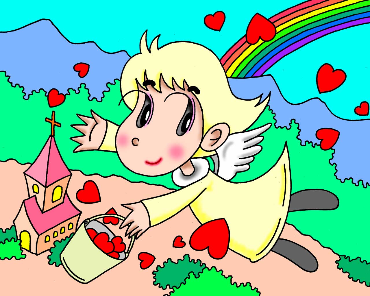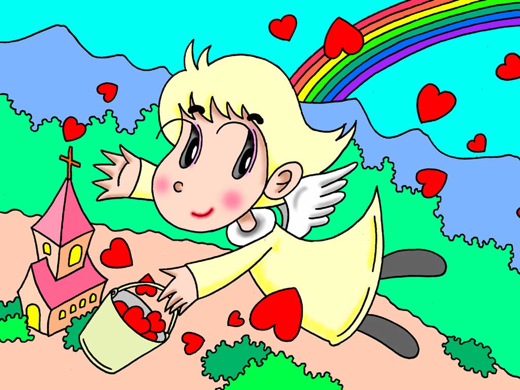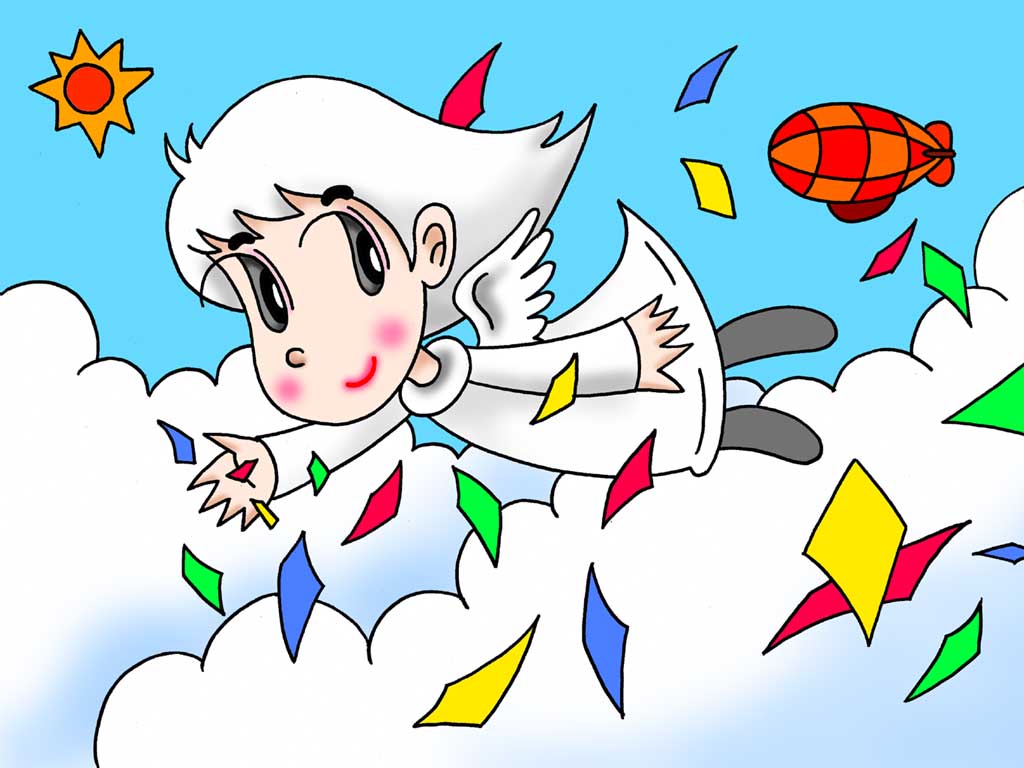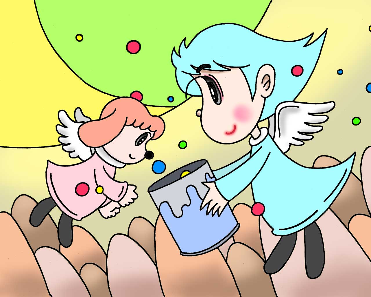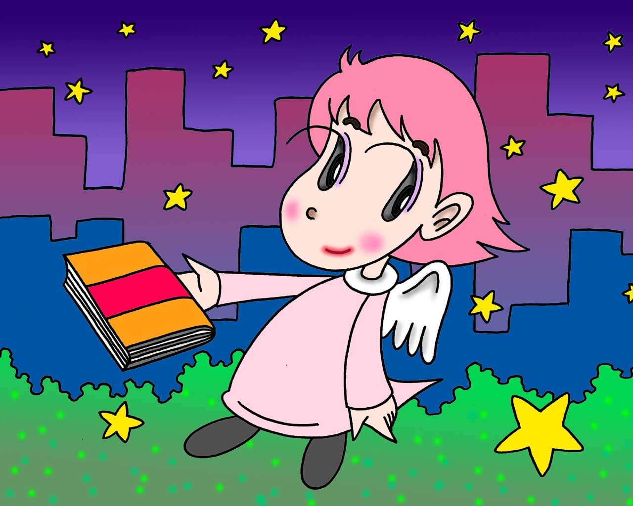 天使キャラクター・イラスト壁紙 .4「オリジナル・天使キャラクター」第4弾 <犬天使とのコミュニケーション。箱の中から飛び出しているものは何?>